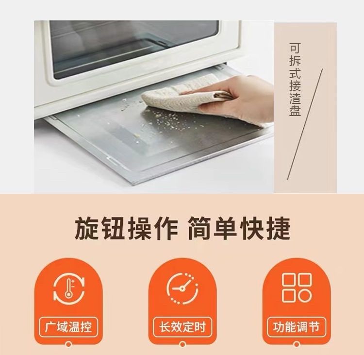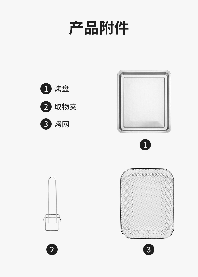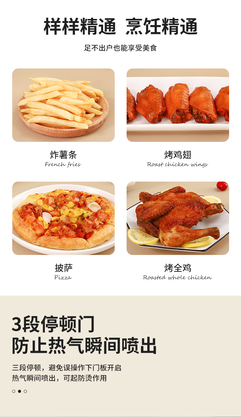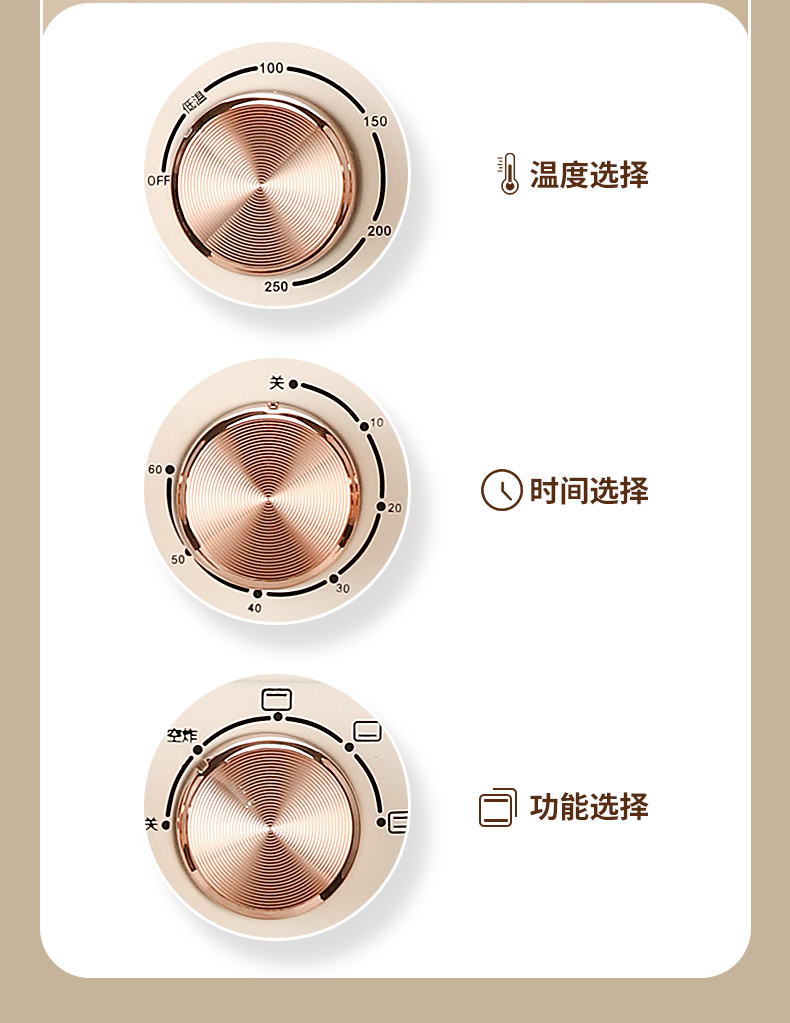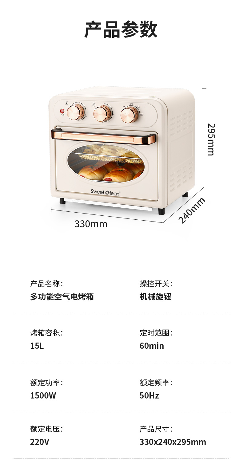 【特點】自動定時炙烤,上下管獨立控溫,發(fā)熱均勻,90~250°C可調(diào)溫,旋鈕開關(guān)設(shè)計,輕松好上手,時間、溫度、功能皆可選,可視玻璃隨時可以觀察烘焙結(jié)果,空氣炸、燒烤、烘焙、干果等多種烘焙方式,多層烤網(wǎng)可同時烘焙。