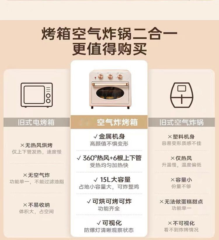 空氣炸烤箱結(jié)合兩者的有點所出,金屬機身,高顏值不懼變形,360°熱風(fēng)外加6根上下管,15L大容量高顏值隨意擺放。