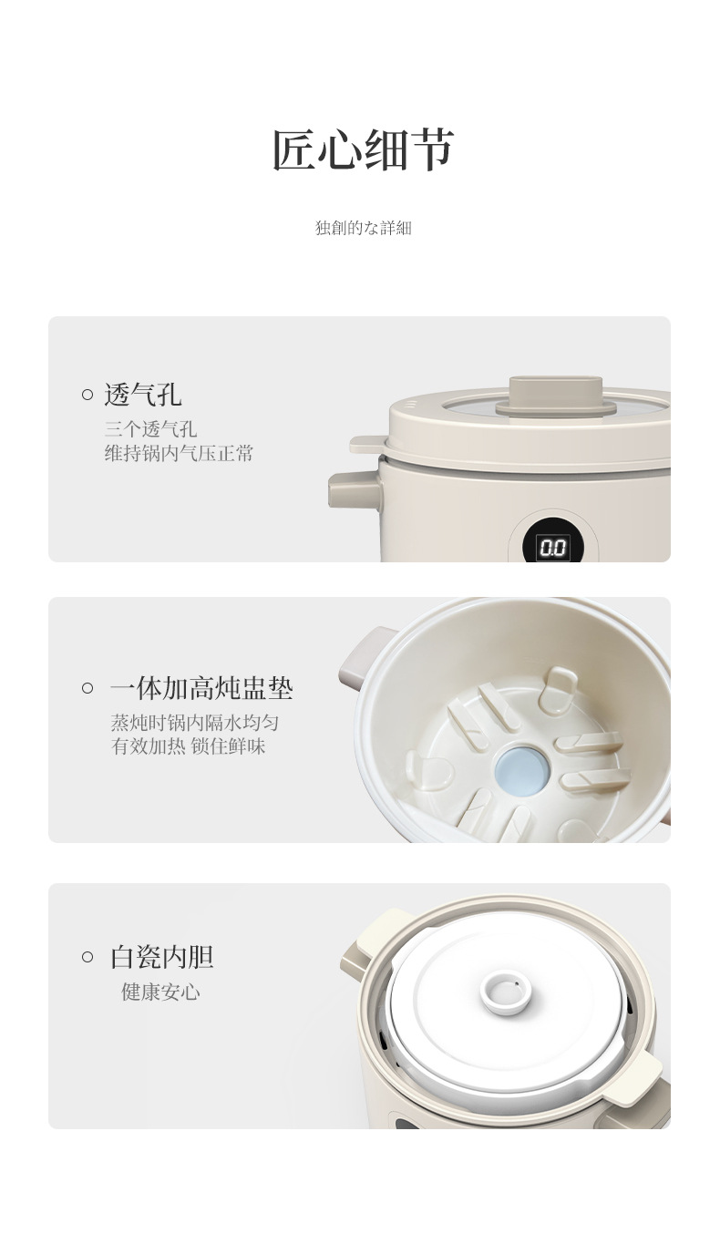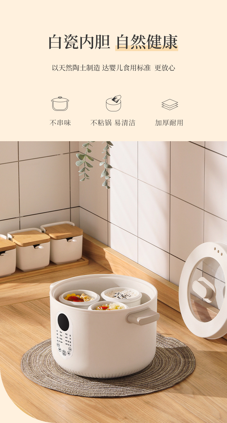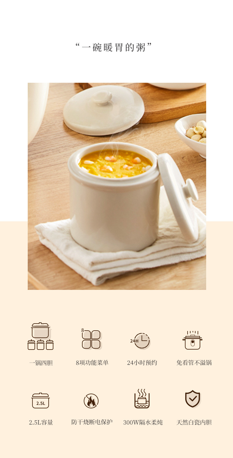 【特點】免看管不溢鍋,24小時可預約時間,24小時智能保溫,2.5L大容量,300w文火隔水柔燉,緊鎖鮮香高質營養(yǎng),一鍋四膽,方便又實用,煲煮蒸燉,花樣口味,一應俱全,5~6人份份量,滿足全家人口味。