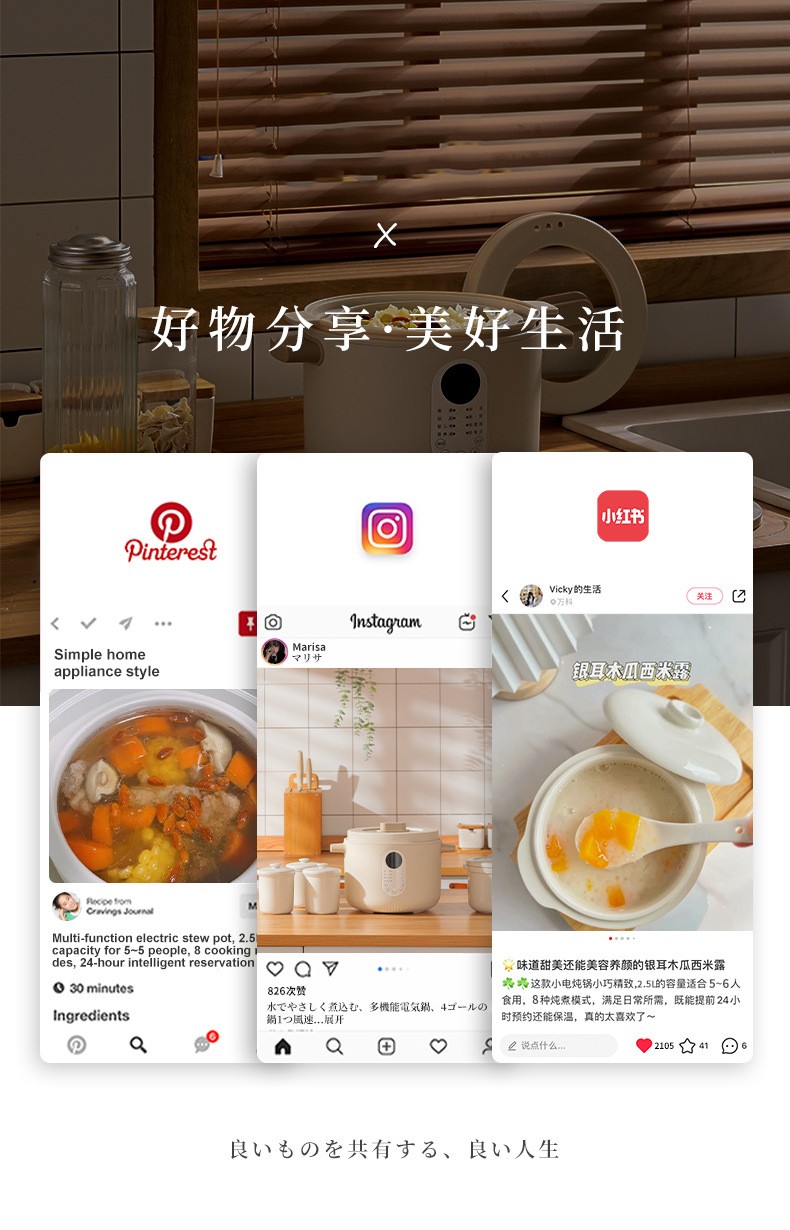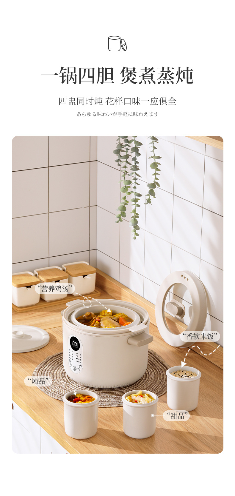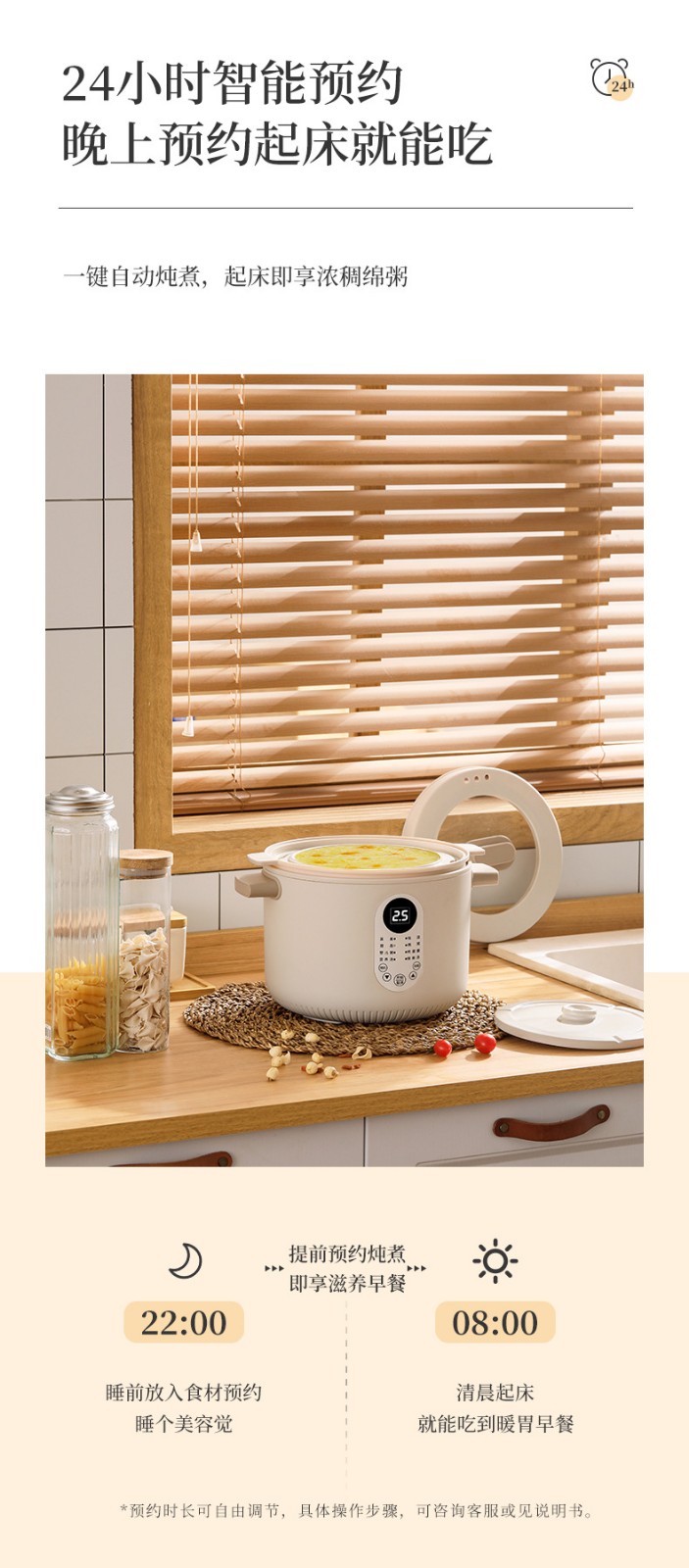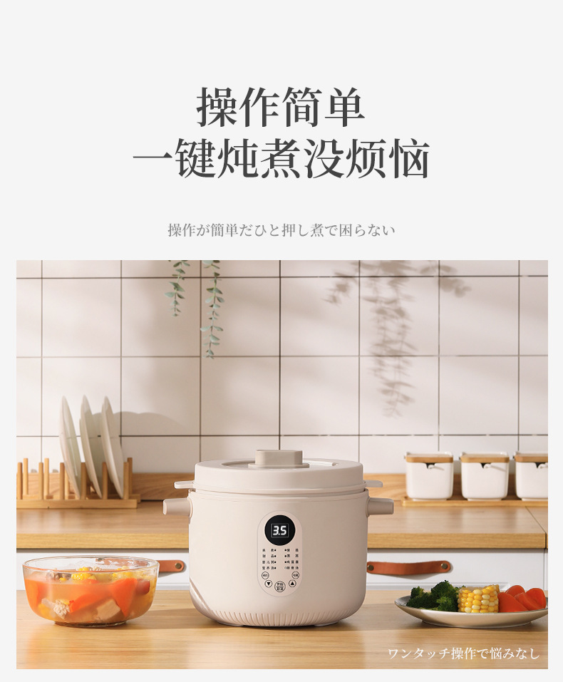 【特點】免看管不溢鍋,24小時可預約時間,24小時智能保溫,2.5L大容量,300w文火隔水柔燉,緊鎖鮮香高質營養(yǎng),一鍋四膽,方便又實用,煲煮蒸燉,花樣口味,一應俱全,5~6人份份量,滿足全家人口味。