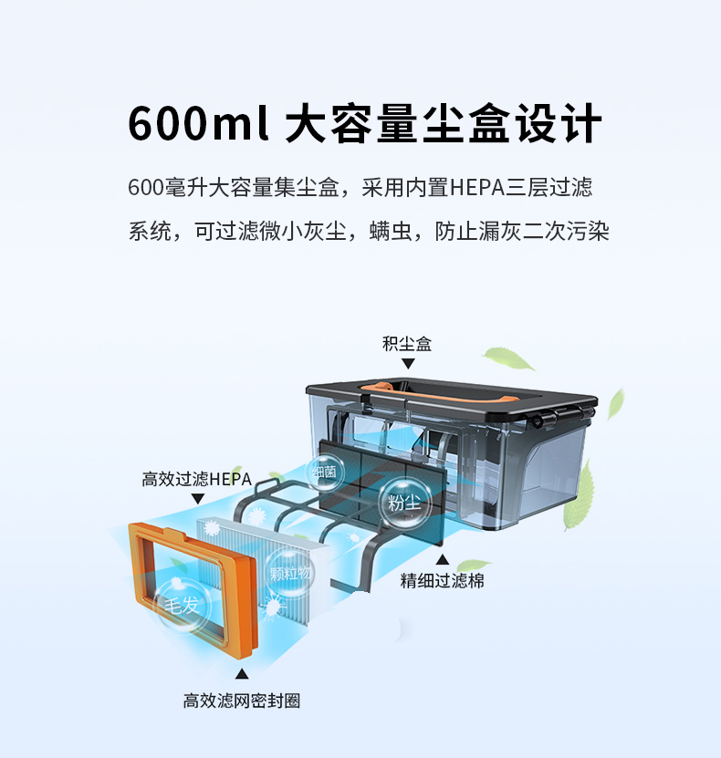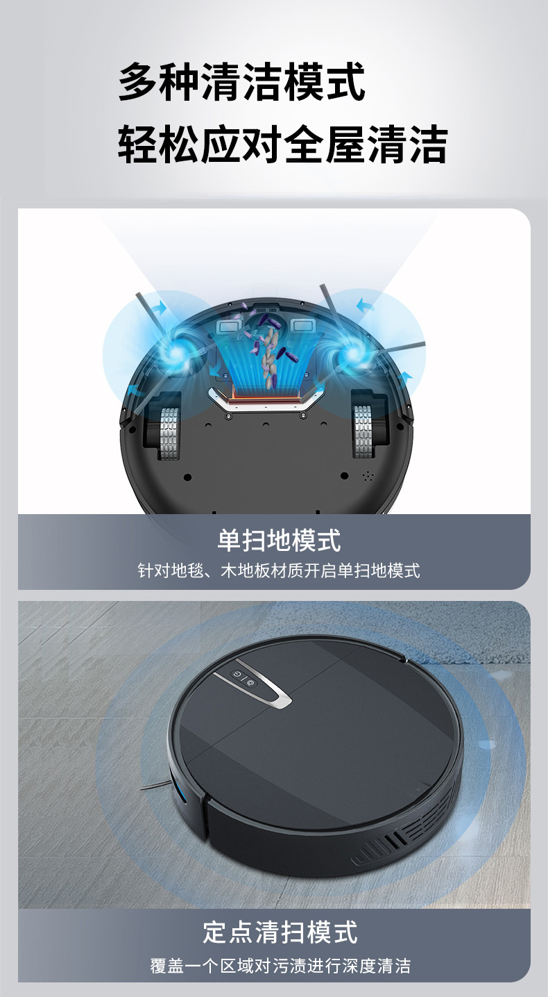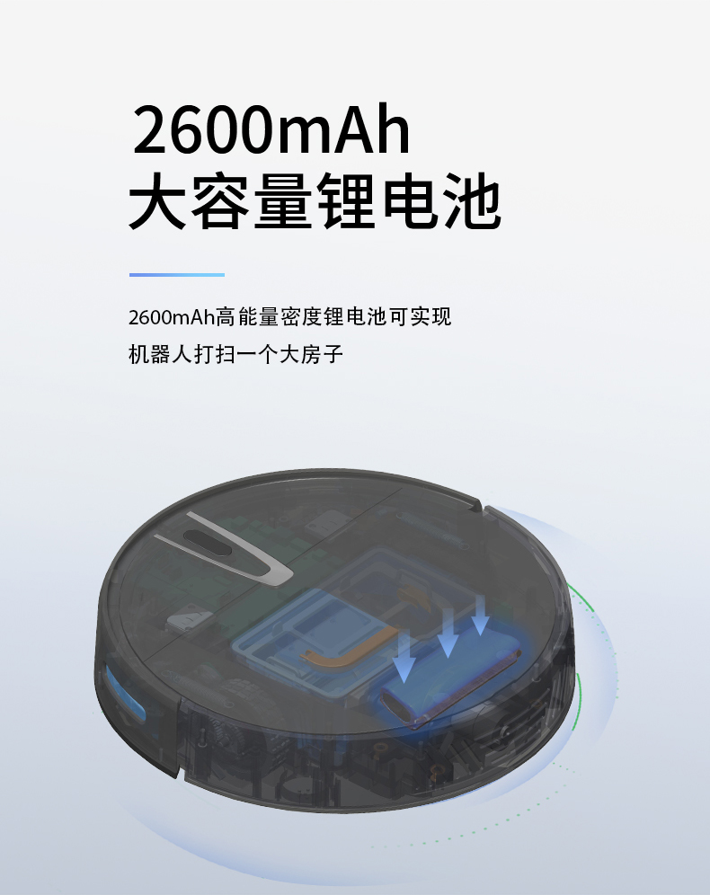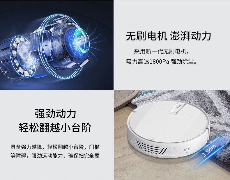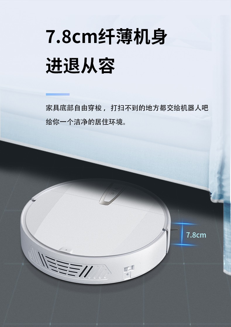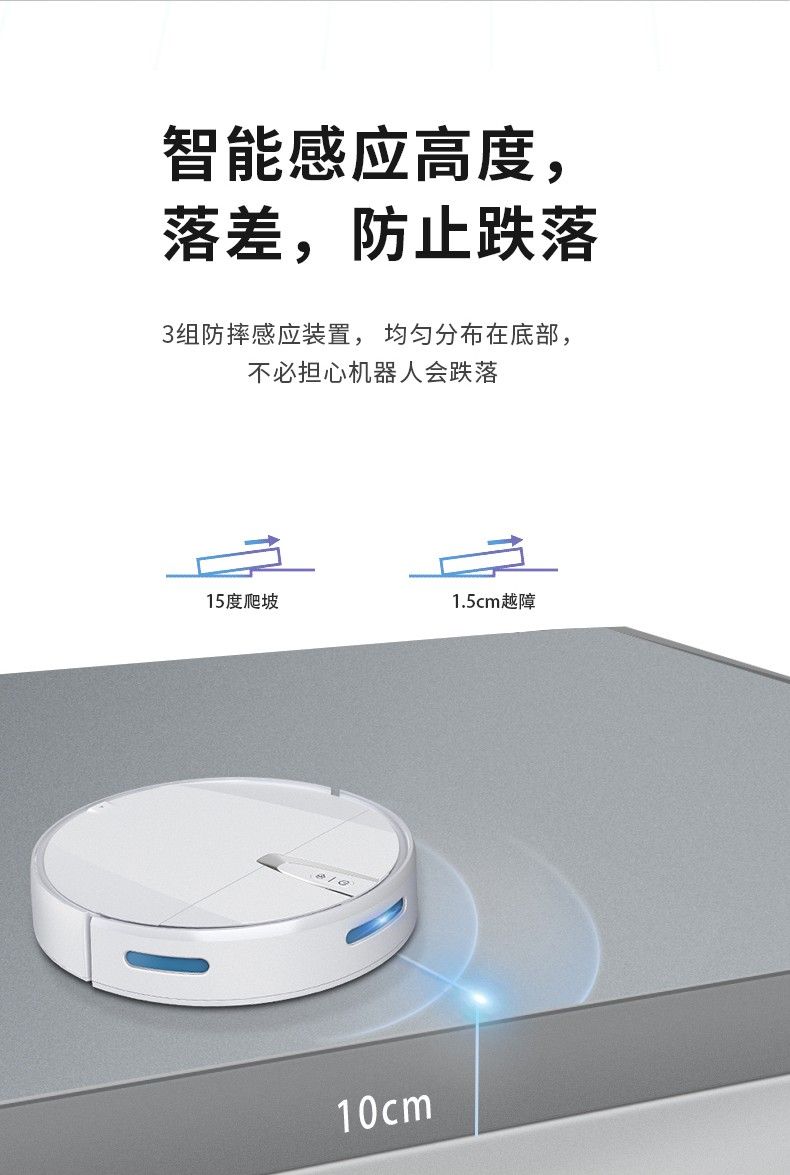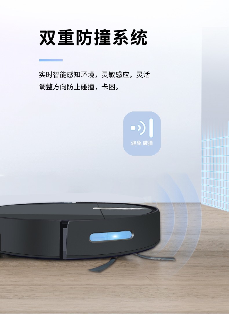 大吸力高除塵雙邊刷聚攏灰塵,清掃范圍大,1800Pa強勁吸力掃除縫隙灰塵,防纏繞真空吸口不懼毛發(fā)鋼珠,大面積拖布清潔效率更高。雙重防撞系統(tǒng)實時智能感知環(huán)境,靈敏感應靈活調整方向防止碰撞卡困。7.8cm纖薄機身家具底部自由穿梭。智能感應高度落差,防止跌落3組防摔感應裝置,均勻分布在底部不必擔心機器人會跌落。貼地濕拖前后拖更高效,恒壓貼地濕拖摻水均勻深度清潔。2600mAh大容量鋰電池,高能量密度鋰電池可實現,多種清潔模式輕松應對全屋清潔。無刷電機吸力高達1800Pa強勁除塵。600ml大容量塵盒采用內置HEPA三層過濾系統(tǒng)防止漏灰二次污染。