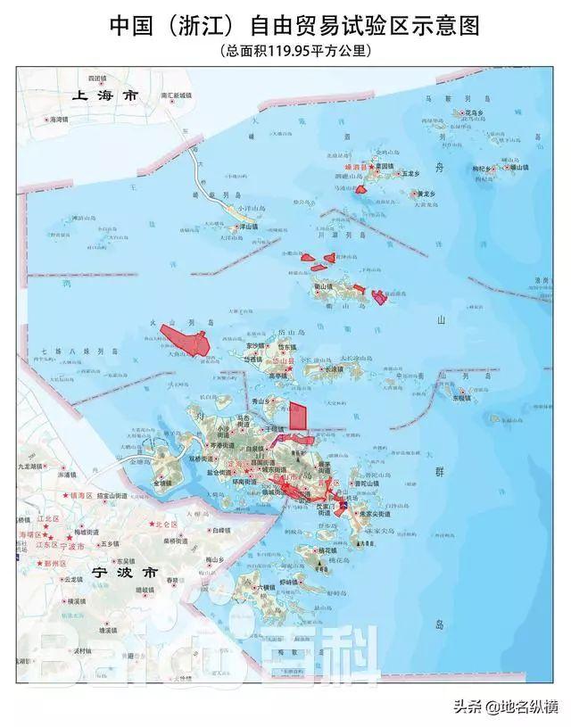 中國(浙江)自由貿(mào)易試驗區(qū)涵蓋舟山離島片區(qū)78.98平方公里、舟山島北部片區(qū)15.62平方公里、舟山島南部片區(qū)25.35平方公里,總面積119.95平方公里,2017年4月1日掛牌。