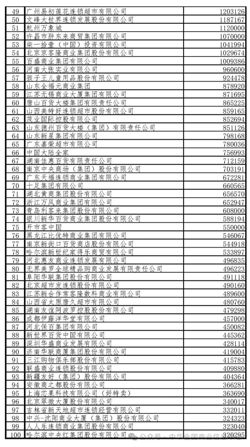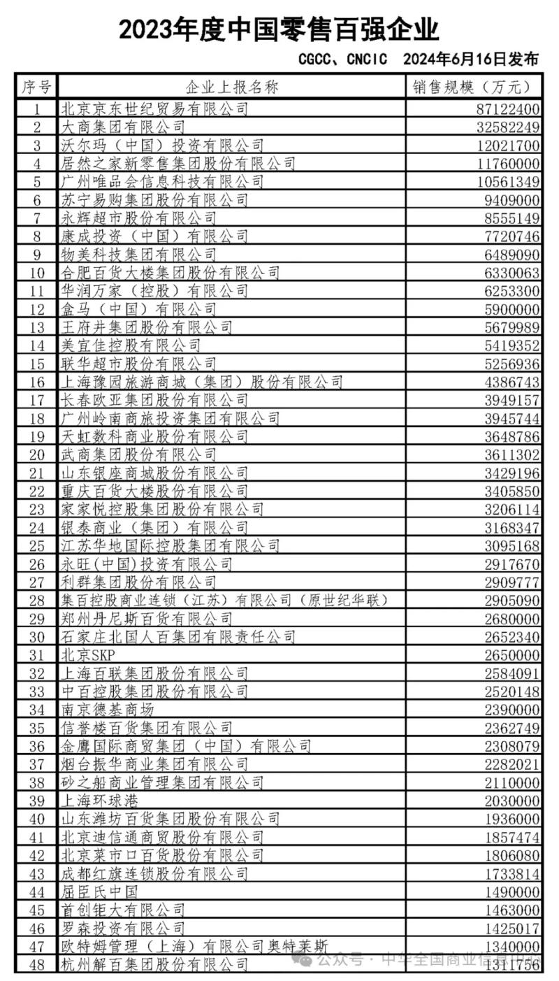 位于此次《2023年度中國零售百強企業(yè)名單》前十名的公司依次是:北京京東世紀(jì)貿(mào)易有限公司、大商集團(tuán)有限公司、沃爾瑪(中國)投資有限公司、居然之家新零售集團(tuán)股份有限公司、廣州唯品會信息科技有限公司、蘇寧易購集團(tuán)股份有限公司、永輝超市股份有限公司、康成投資(中國)有限公司、物美科技集團(tuán)有限公司、合肥百貨大樓集團(tuán)股份有限公司。另外,盒馬(中國)有限公司以590億元的銷售規(guī)模排名第12位。