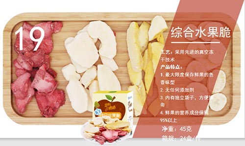 目前福建利眾誠食品有限公司已經(jīng)研發(fā)生產(chǎn)了多款適合家庭廚房的餐飲食品,其中包括凍干休閑果蔬干系列、素食湯/粥、固體飲料、凍干果樹代餐粉及益生菌粉、凍干酸奶溶豆、凍干面條、凍干肉制品、海鮮制品、水產(chǎn)品等。其中產(chǎn)品之一的凍干酸奶塊,吃一塊就相當(dāng)于飲用一輩酸奶的營養(yǎng)價(jià)值,凍干系列產(chǎn)品在加工過程中的營養(yǎng)和維生素C只損失3%,濃縮的都是原食材的精華,完美保留了食品的營養(yǎng)。